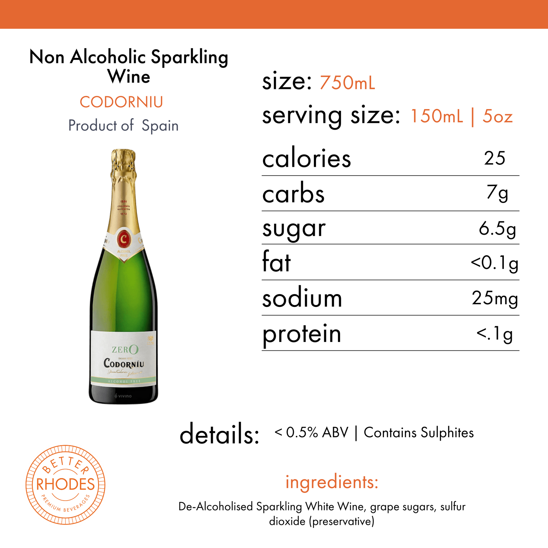 Codorníu Zero is a delicious non alcoholic sparkling wine. It is dealcoholized, and contains fresh tropical fruit notes and citrus flavors, which pair perfectly with any occasion requiring an celebration when you're abstaining. Its fine bubble, fruity character and harmonious balance make it an exceptional experience.