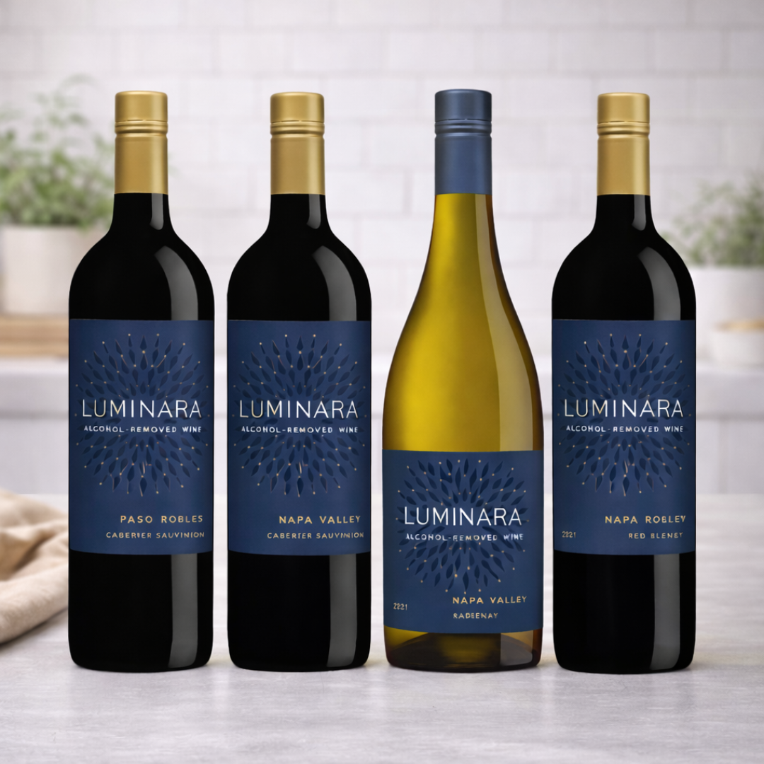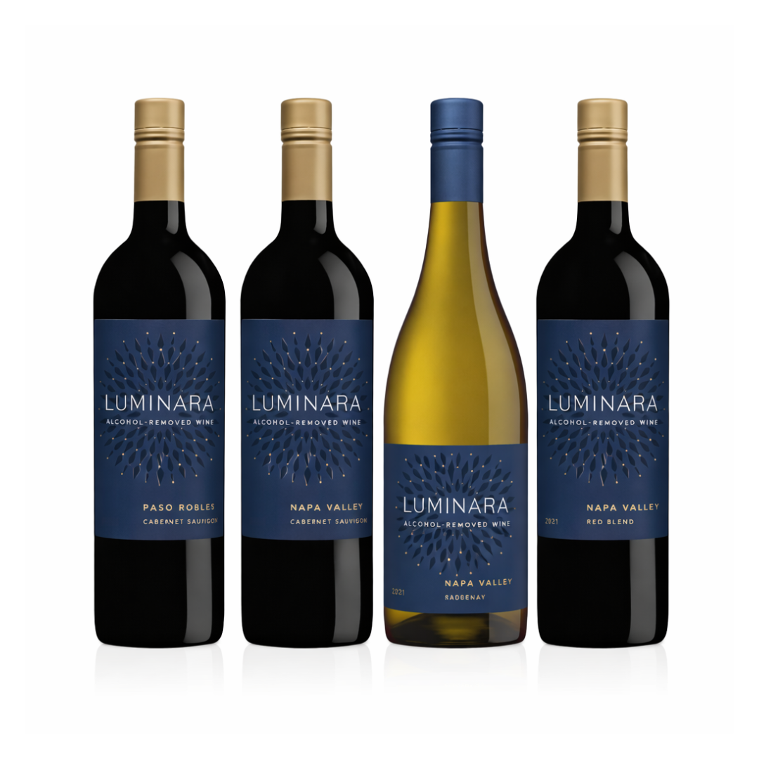 This Premium four-bottle Napa Valley collection brings together Luminara Non-Alcoholic Paso Robles, Luminara Non-Alcoholic Cabernet Sauvignon, Luminara Non-Alcoholic Napa Red Blend, and Luminara Non-Alcoholic Chardonnay Wine. Each wine reflects the richness and elegance associated with classic Napa winemaking, without the alcohol.