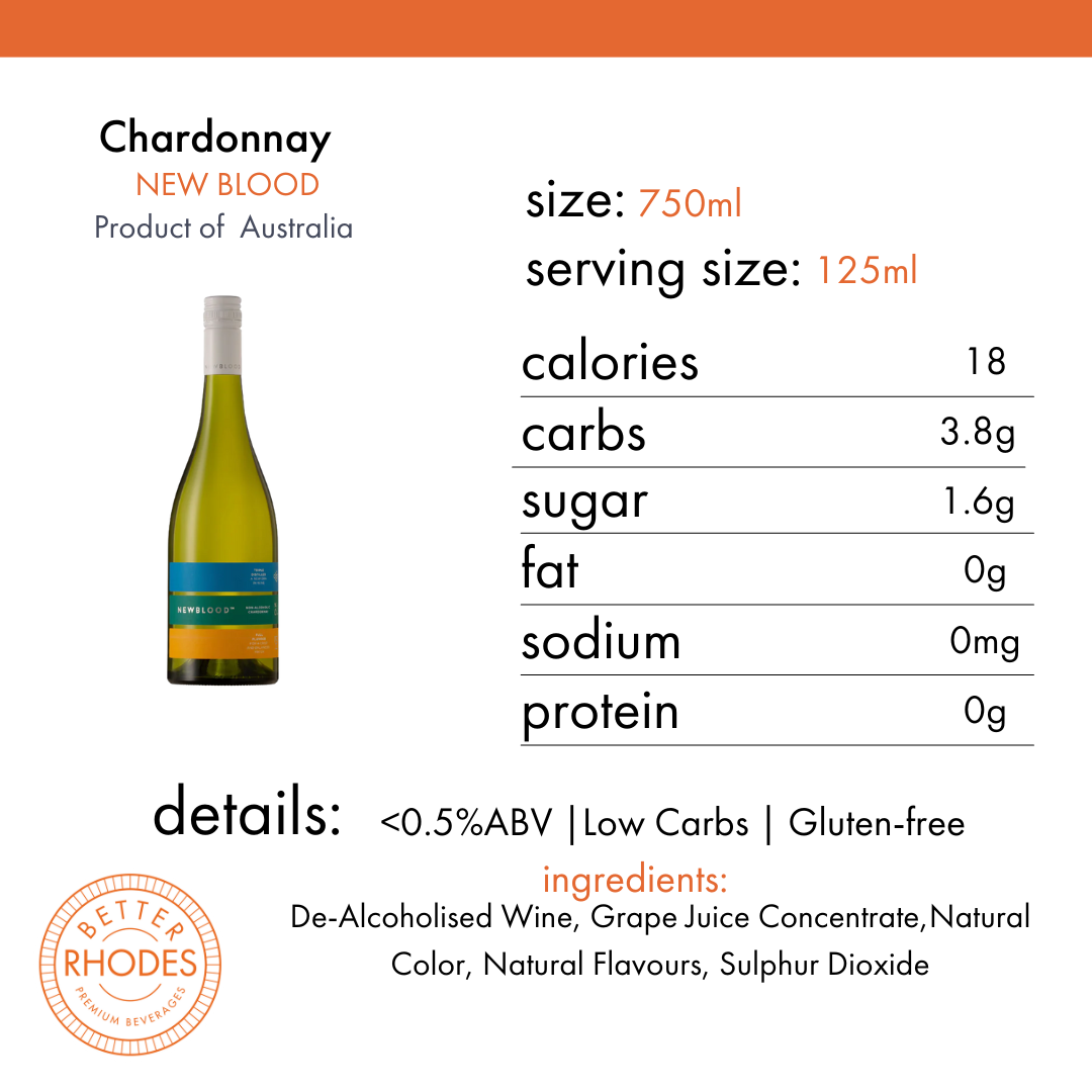 NEWBLOOD Non-Alcoholic Chardonnay is pale straw in appearance, with a vibrant bouquet of citrus blossom and honeysuckle, leading to a crisp palate that’s fresh and balanced. Serve chilled.