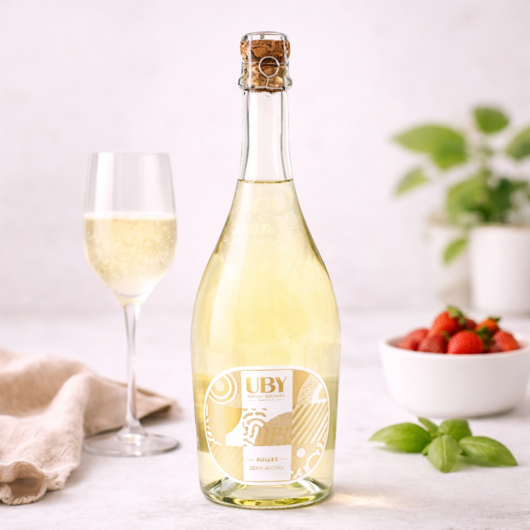 UBY 0% Sparkling is a refreshing, sparkling drink made from de-alcoholized wine. It offers the same fresh and fruity aromatic profile as traditional UBY wines. Perfect to enjoy from an aperitif to dessert.